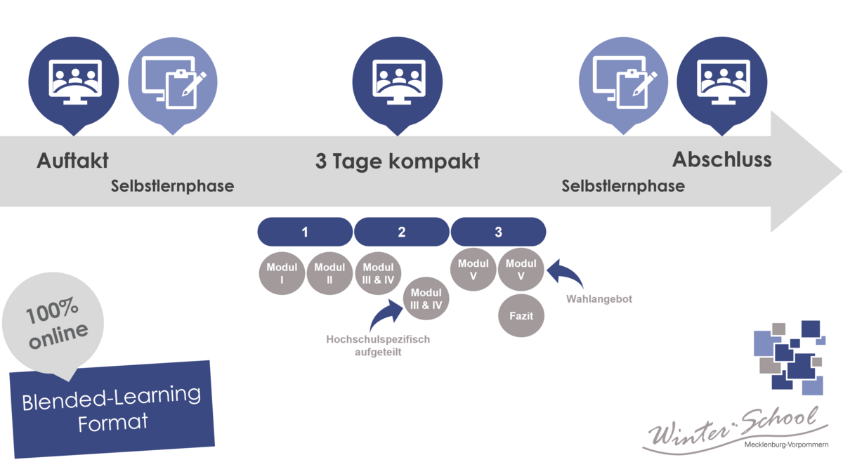 Die Winter School war ein kompaktes Schulungsprogramm zum Thema Hochschullehre digital bereichern. Sie richtete sich an Lehrende aller Hochschulen in Mecklenburg-Vorpommern und wurde im Rahmen des Landesprogramms "Digitale Transformation (2021-2024)" im November 2022, November 2023 und September 2024 angeboten.