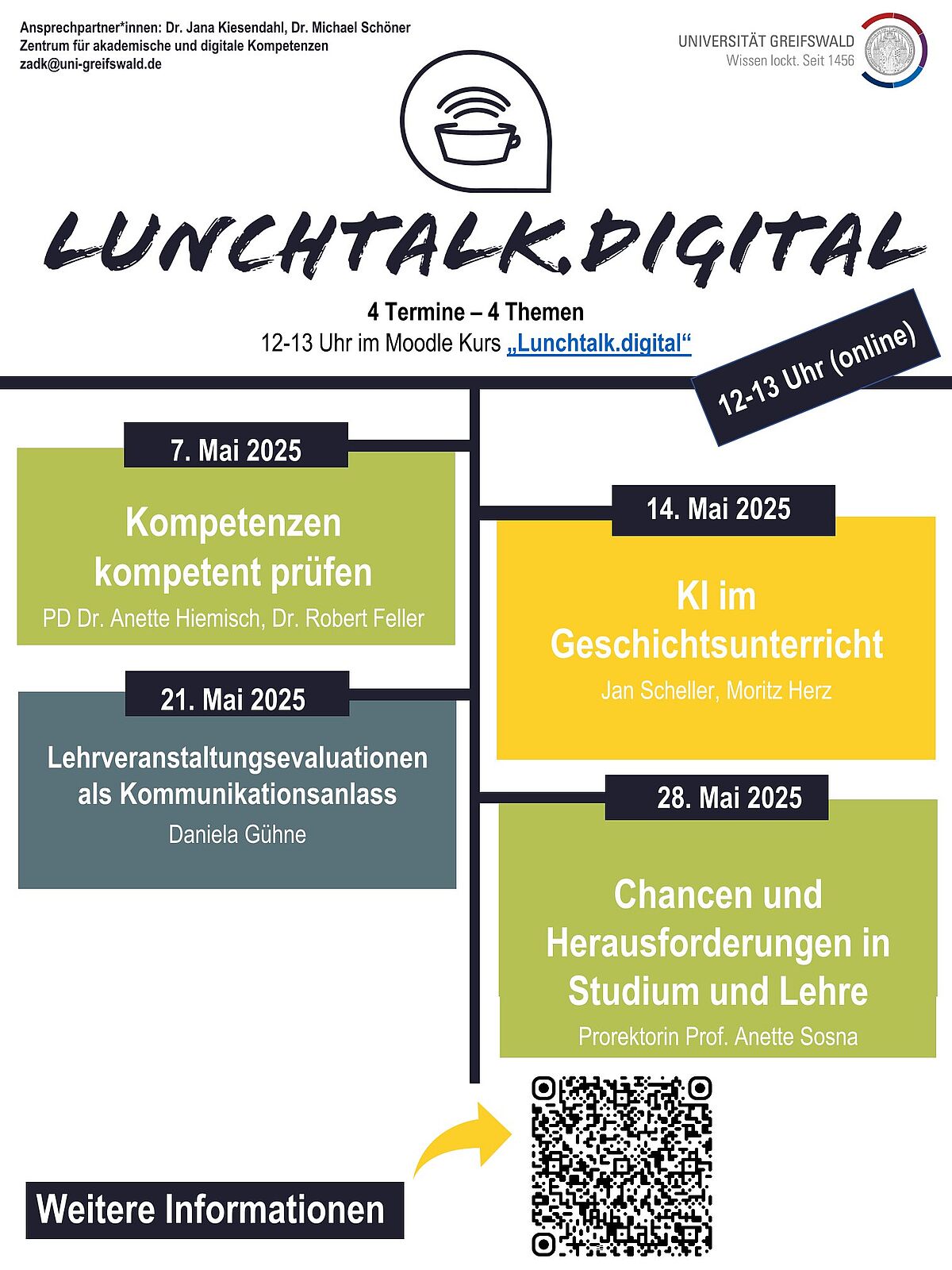 Der Lunchtalk.digital ist ein sehr interaktives Format, bei dem wir uns kollegial über spannende und aktuelle Themen rund um Lehren und Lernen auseinandersetzen, Strategien für unsere eigene Lehrpraxis erarbeiten, uns kritisch mit neuen Trends auseinandersetzen und von der Erfahrung und den Ideen der anderen Teilnehmenden profitieren wollen. Von 12-13 Uhr treffen wir uns im Moodle-Kurs Lunchtalk.digital und kommen ins Gespräch.