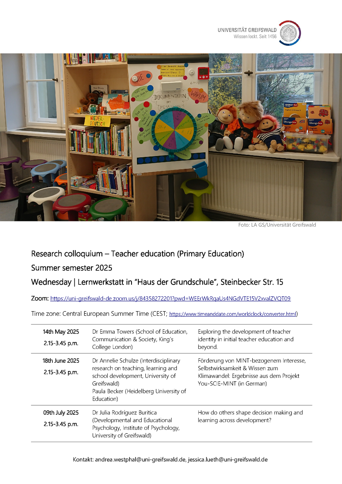 Die Universität Greifswald lädt Sie herzlich zum Research Colloquium Teacher Education (Primary Education) ein: