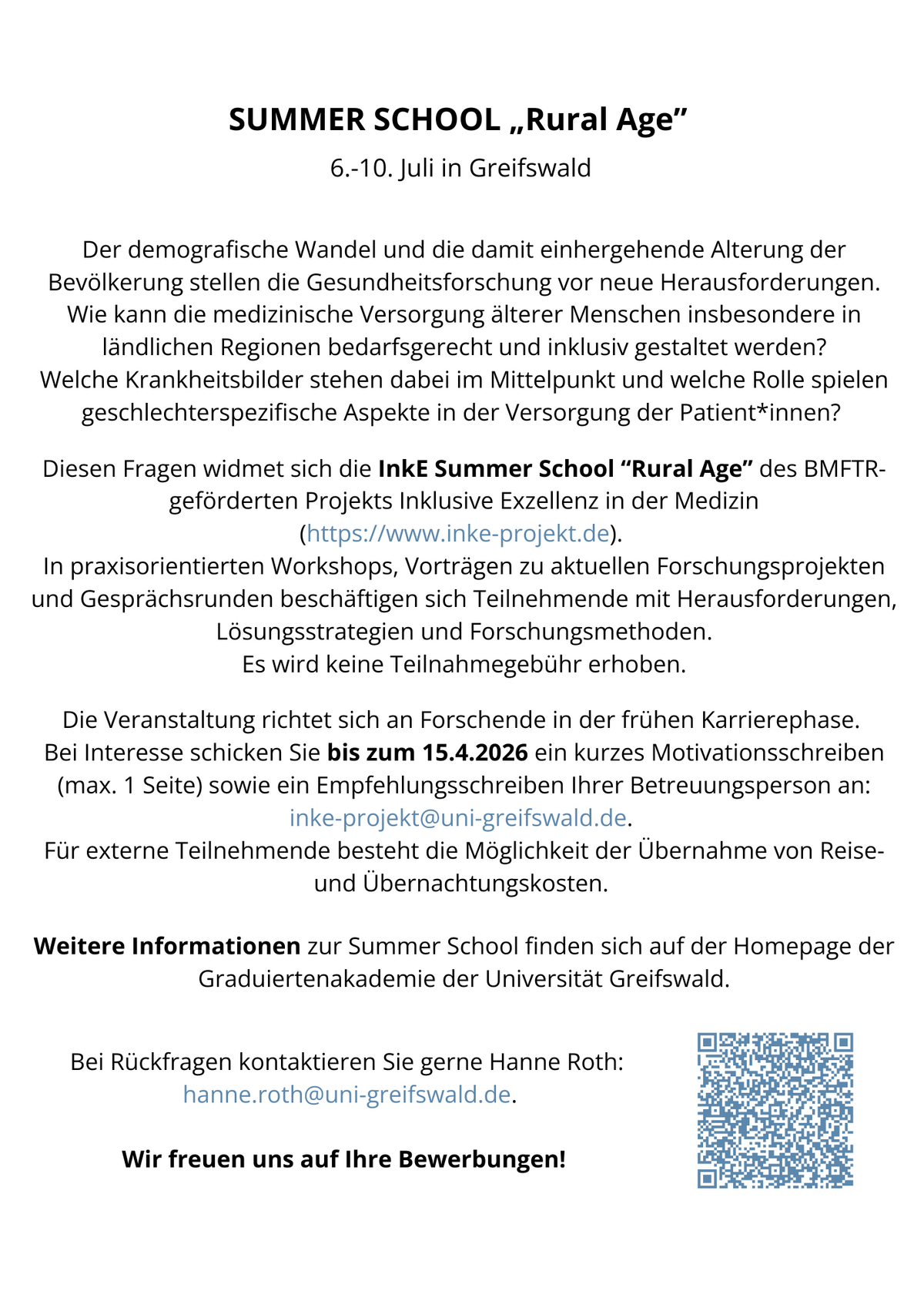 Im Sommersemester 2026 organisiert die Graduiertenakademie im Rahmen des BMFTR-geförderten Projekts Inklusive Exzellenz in der Medizin (InkE) die Summer School „Rural Age“ (6. – 10. Juli 2026).