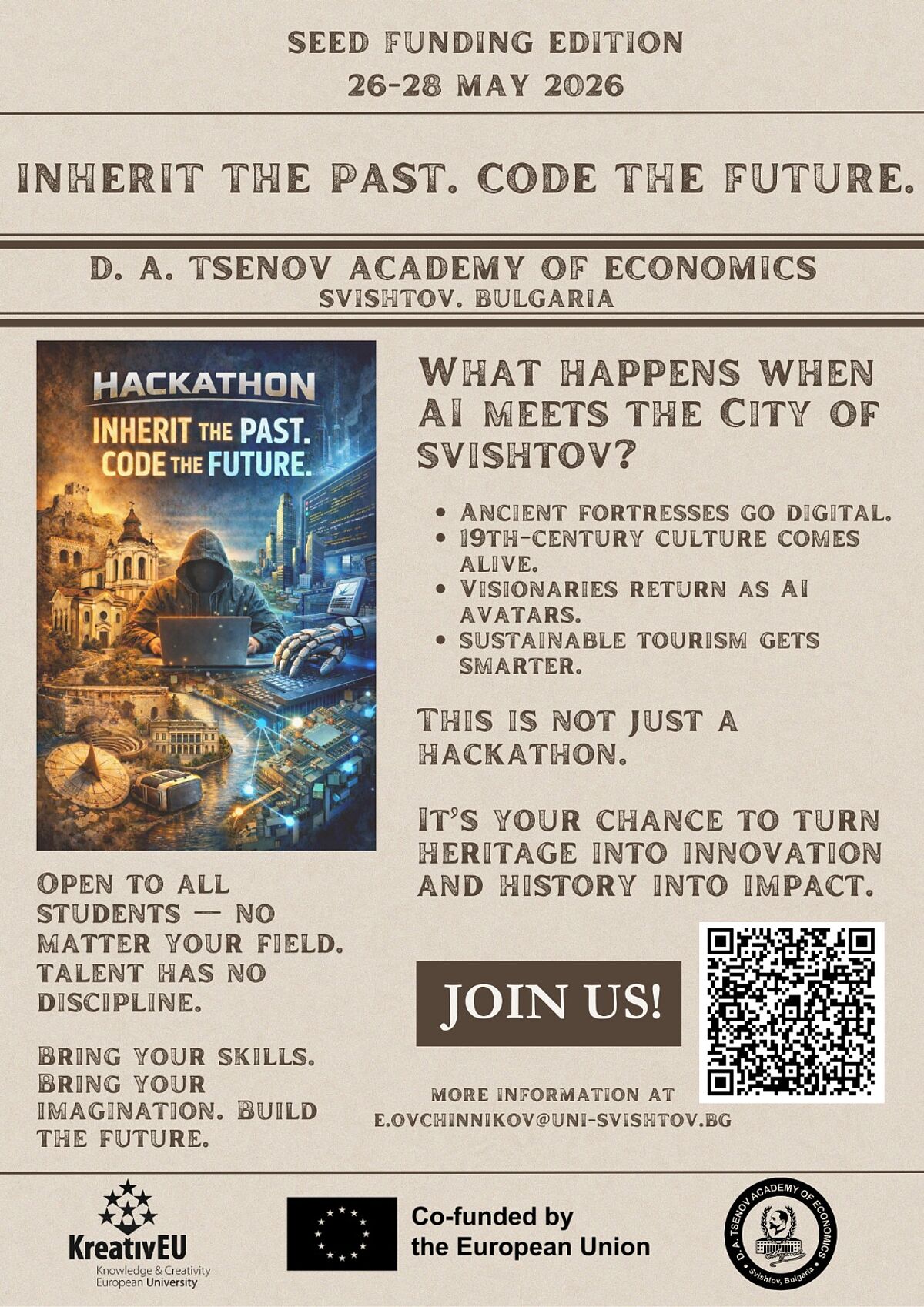 Hackathon in Svishtov: Inherit the Past. Code the Future. 26.05.2026 for studentsFrom 26 to 28 May 2026, a hackathon on AI will take place at the Tsenov Academy of Economics in Bulgaria in Shivstov. Registration is now open!Register here!