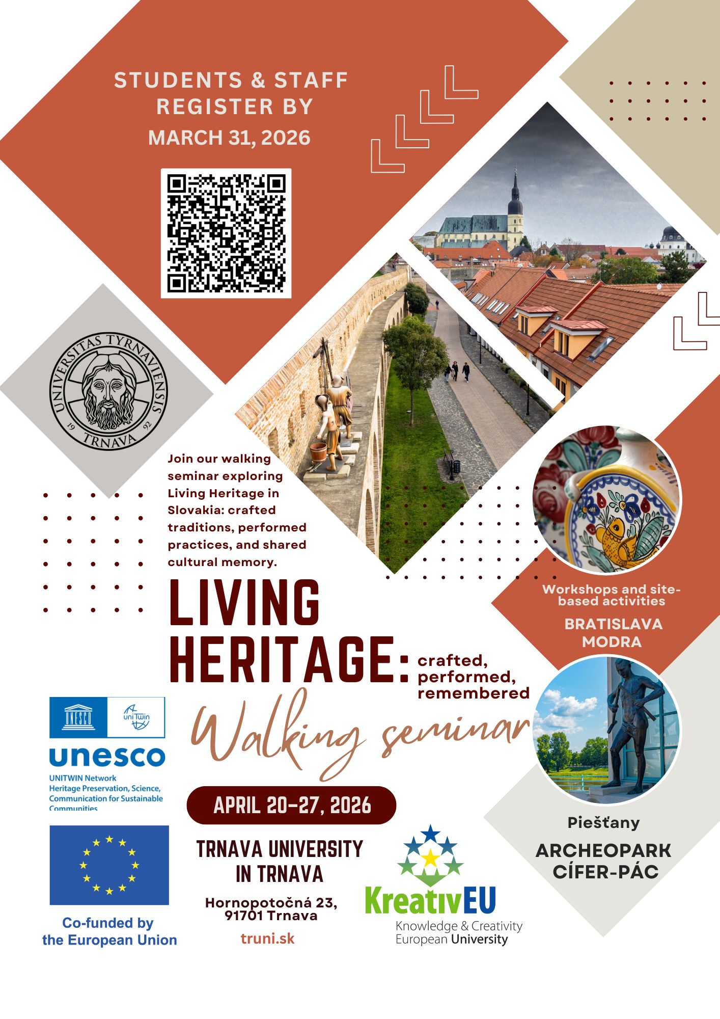 Walking Seminar in Trnava: Living Heritage: Crafted, Performed, Remembered 20.04.2026 From 20 to 27 April 2026, Trnava University in Slovakia will host a walking seminar on the topic of ‘Living Heritage: Crafted, Performed, Remembered’.More information can be found here.