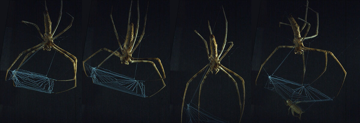 Using high-speed imaging and high-resolution electron microscopy, the research team analysed both the dynamics of how the net is cast as well as the structure of the silk. They discovered a previously unknown structural principle: the central silk threads at the heart of the web-casting spider’s prey-catching net are elastic and by moving its so-called spinnerets – small protrusions in the abdomen – the spider is able to microstructurally adapt its silk by adding windy and crinkled threads to the stretchy ones. This not only changes the metastructure of the silk, but also its material properties. The curly threads are stiffer than the elastic ones and once extended provide added strength to the net.