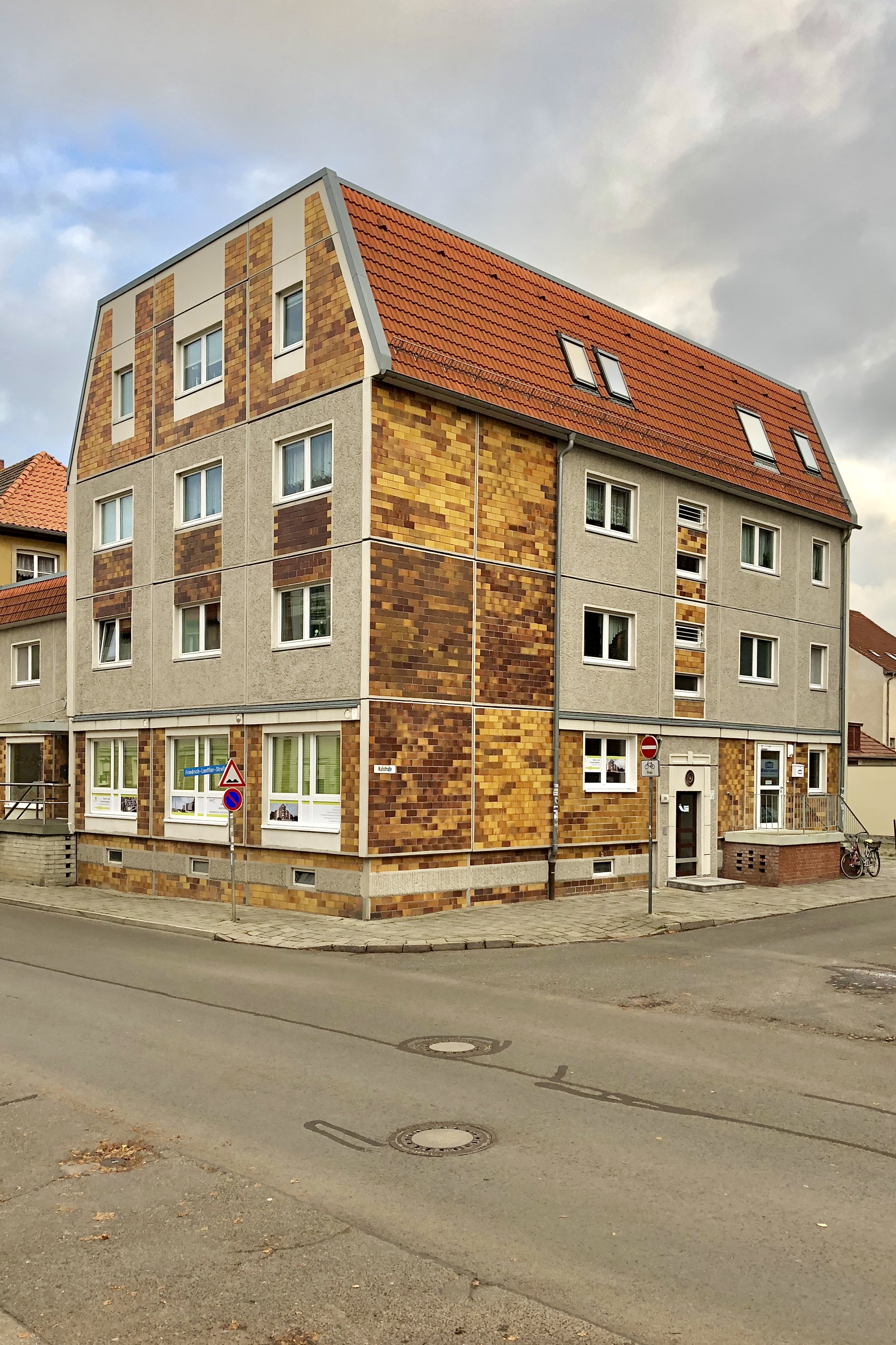 Die mittelalterliche Planstadt auf schachbrettartigem Grundriss schien perfekt für ein Experiment. Mit der Altstadtplatte wollte eine junge Planer*innengeneration verfallende Straßenzüge passgenau rekonstruieren. Nur einzelne historische Häuser wurden bewahrt und neu in Szene gesetzt, während man die Neubauten in abwechslungsreichen Plattenformaten und mit künstlerischen Schmuckmotiven aufwertete.