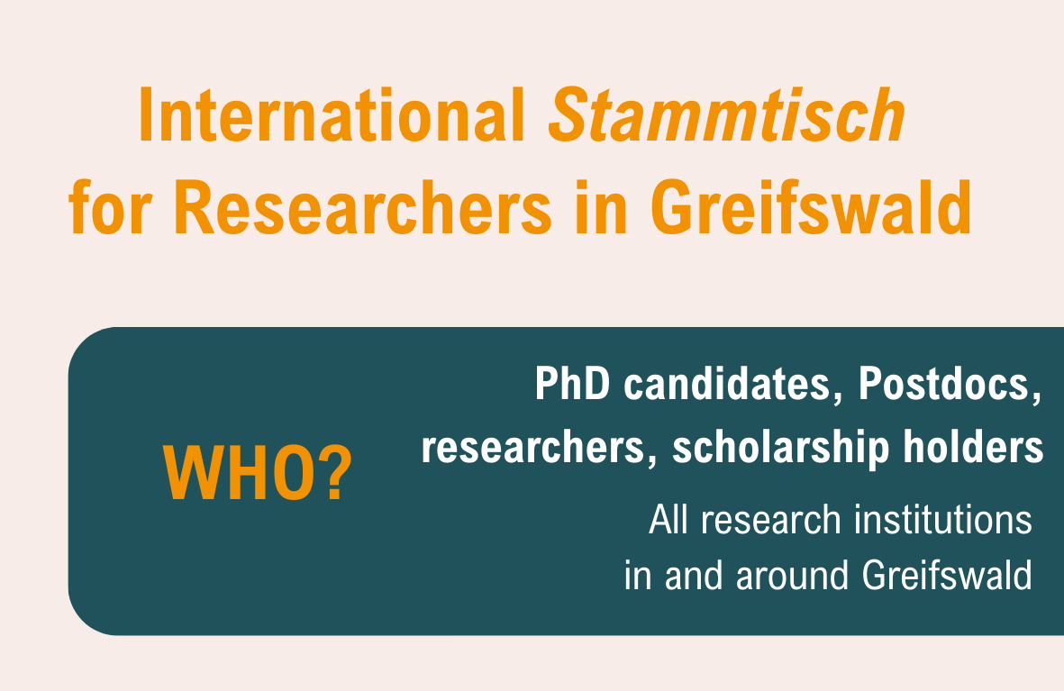 Der Stammtisch ist eine wunderbare Gelegenheit, in einer entspannten und einladenden Atmosphäre Kontakte zu knüpfen. Er soll die internationale akademische Gemeinschaft stärken und gleichzeitig Brücken zwischen internationalen und lokalen Kollegen bauen. Wir heißen auch internationale und deutsche Forscher aus anderen wissenschaftlichen Einrichtungen in und um Greifswald herzlich willkommen.