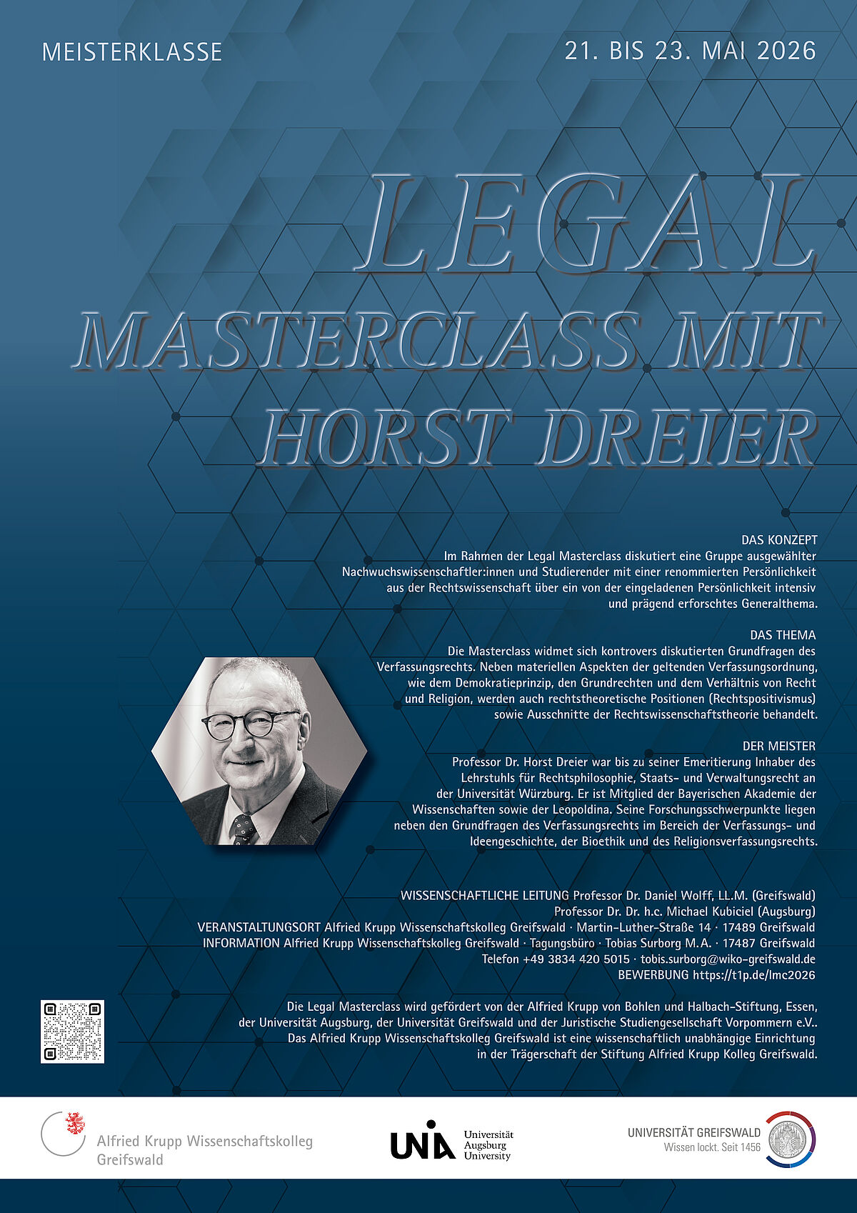 Die Legal Masterclass bringt mit Professor Dr. Horst Dreier eine herausragende Persönlichkeit der Rechtswissenschaft mit ausgewählten Nachwuchswissenschaftler:innen und besonders interessierten Studierenden ins intensive Gespräch. Im Mittelpunkt stehen kontrovers diskutierte Grundfragen des Verfassungsrechts, die das Demokratieprinzip, die Grundrechte, das Verhältnis von Recht und Religion sowie rechtstheoretische Positionen berühren. Die zweitägige Veranstaltung umfasst einen öffentlichen Abendvortrag und mehrere vertiefende Seminarsitzungen, die auf zentralen Publikationen des Meisters aufbauen. Der Abendvortrag richtet sich an ein breiteres universitäres und außeruniversitäres Publikum.