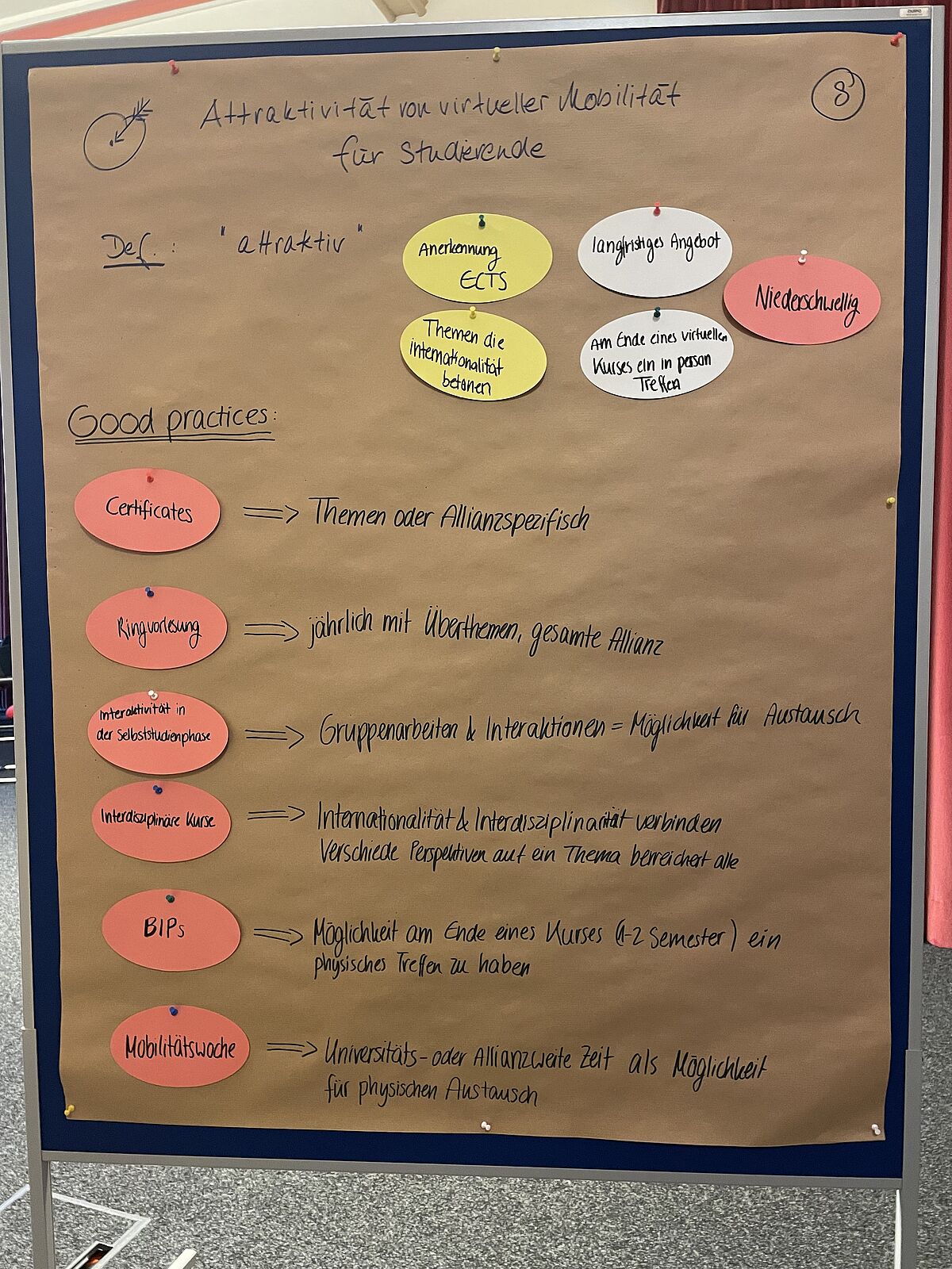 Dorthe G. A. Hartmann warf die Frage auf, wie virtuelle Mobilität für Studierende attraktiv gestaltet werden könne, und freute sich diesbezüglich auf Hinweise der Studierenden auf Kriterien, die für sie attraktive virtuelle Mobilitätsangebote ausmachen, und auf Good Practice Beispiele, von denen Projektverantwortliche aus ihren Allianzen berichten würden. Es wurde deutlich, dass für die Studierenden die Anrechenbarkeit auf das eigentliche Studium als wichtig erachtet wird, ebenso Interdisziplinarität in der Behandlung der Themen und Interaktivität in der Selbststudienphase. Idealerweise würde eine virtuelle Mobilität mit einem kurzen Kennenlernen der Akteur*innen in Präsenz enden. Als erfolgreiche Good Practice Beispiele wurden Ringvorlesungen und auch allianz- oder themenspezifische Zusatzzertifikate angeführt, letztere, wenn die Anrechnung auf das eigentliche Studium nicht möglich ist.