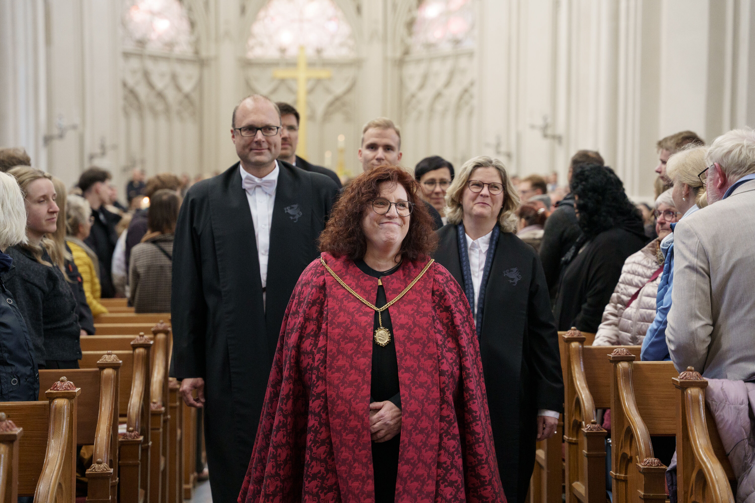 In ihrer Ansprache an die neuen Studierenden betonte Rektorin Prof. Dr. Katharina Riedel, wie bedeutend diese neue Lebensphase ist: „Heute beginnt für Sie ein neuer Lebensabschnitt, zwischen Vertrautem und Neuem, zwischen Schule und Wissenschaft, zwischen Herkunft und Zukunft.“ Weiter ging sie auf die aktuellen Herausforderungen ein und betonte, dass die Universität ein Ort sei, an dem Wissen entsteht und Lösungen für die Fragen unserer Zeit entwickelt werden. „Wenn Sie sich jetzt fragen, wo Ihr eigener Beitrag liegt, dann beginnt er genau hier: Mit Ihrer Neugier, Ihrem Mut und Ihrer Entschlossenheit zu lernen und zu forschen. Denn Zuversicht heißt nicht, Probleme zu leugnen – sondern fest daran zu glauben, dass es sich lohnt, gemeinsam an Lösungen zu arbeiten.“