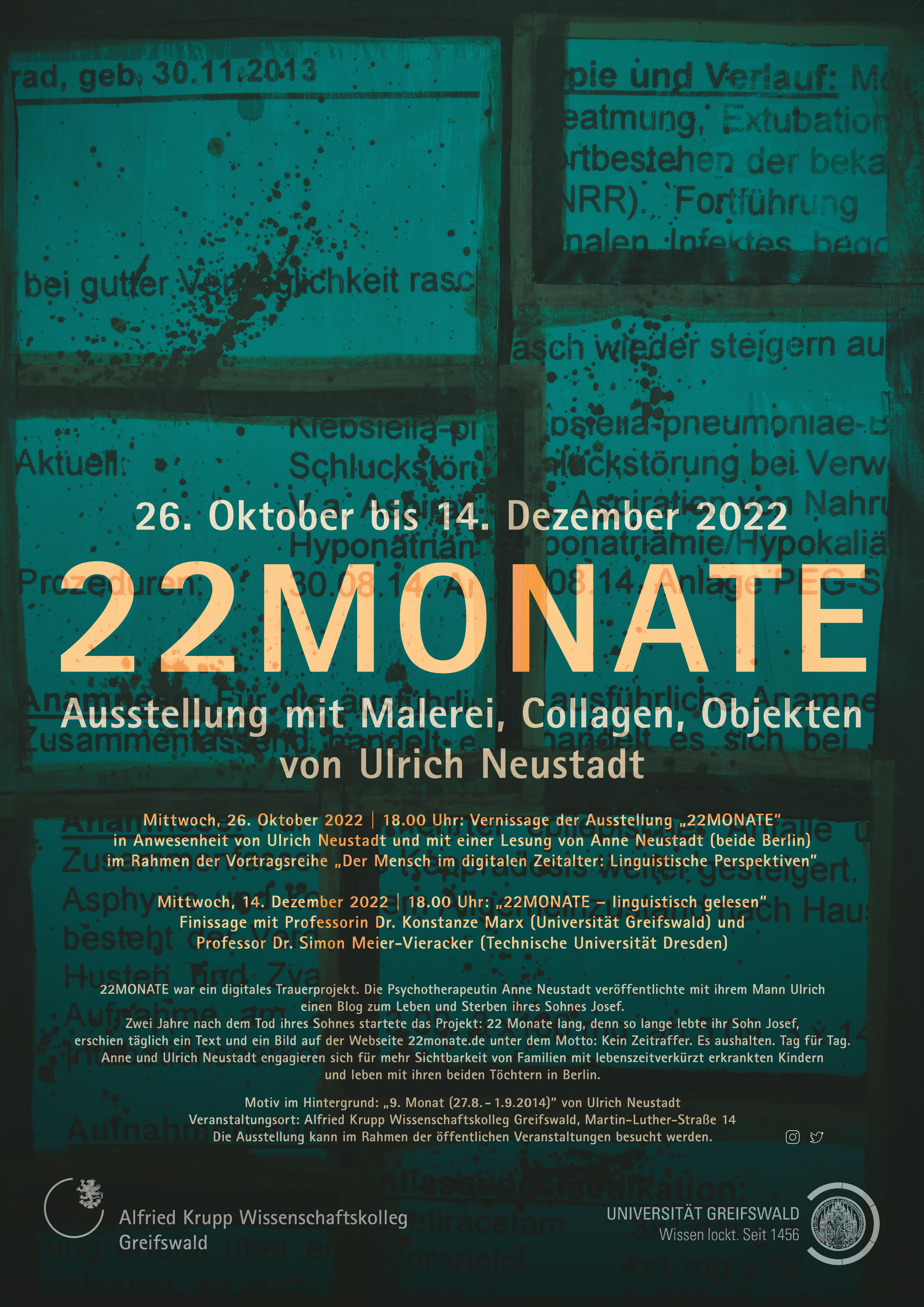 Der Blog 22Monate ist für die internetlinguistische Forschung in mehrfacher Hinsicht interessant. So sind multimodale Kommunikate entstanden, die besonders im Kontext der Ausstellung „22Monate“ eine Verschränkung von digitalem und analogem Raum deutlich machen. In seiner Darbietungsform nutzt der Blog die Affordanzen des World Wide Web in eindrücklicher Weise. Über einen Zeitraum von fast zwei Jahren wurden täglich Texte veröffentlicht, über die Nähe kreiert und ein Diskurs über tabuisierte Themen initiiert wurde. In unserem Vortrag widmen wir uns der Frage, wie die Interaktion mit medizinischen Pflegekräften reflektiert wurde. Wir werden sowohl quantitativ als auch qualitativ unterschiedliche Zugänge zu Vertrauen, Zutrauen und Kompetenz herausarbeiten und versuchen, über die Verknüpfung dieser Komponenten abzuleiten, wie ein angemessener Umgang zwischen Eltern schwer erkrankter Kinder und pflegenden Personen aussehen kann.