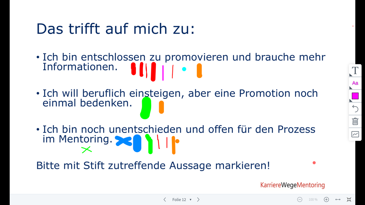 Angela Hoppe, die Programmkoordinatorin dieses Mentoring -Programms hat das Seminar erstmalig digital über BigBlueButton konzeptioniert und geleitet. Das Kennenlernen der Mentees untereinander sowie der beiden zukünftigen Mentorinnen Cosma Hoffmann und Dr. Dana Thal waren ein wichtiger Schwerpunkt, ebenso die Auseinandersetzung mit dem Selbst- und Fremdbild als Doktorandin und die Konkretisierung der persönlichen Mentoring-Ziele und Anliegen. Eine kleine Umfrage zeigte: 88 % der Mentees haben keine promovierten Vorbilder in ihrer Familie.