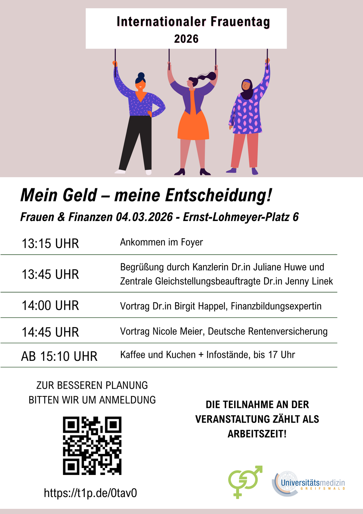 Diese Frauentagsveranstaltung ist eine Initiative der Zentralen Gleichstellungsbeauftragten der Universität Greifswald, die wir gemeinsam mit den Gleichstellungsbeauftragten der UMGreifswald und den NPR-Personalrätinnen der Universität Greifswald auf die Beine gestellt haben.