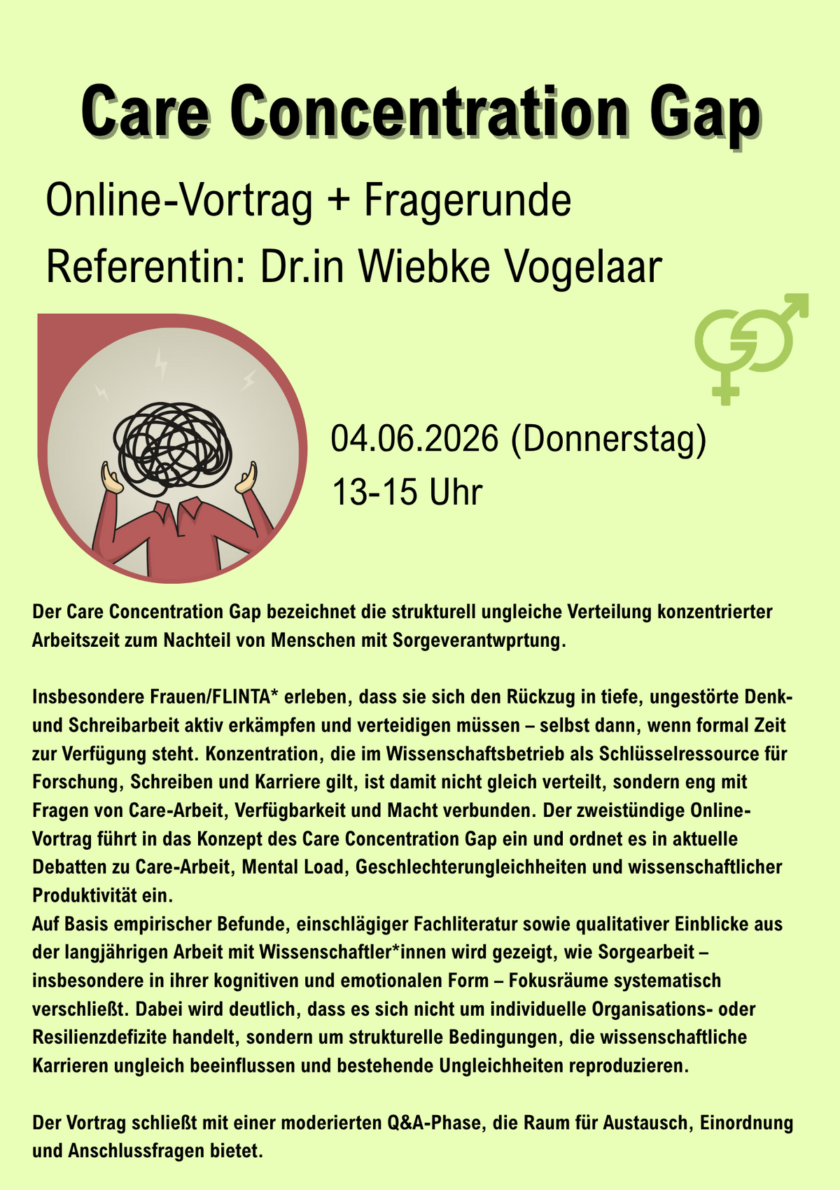 Insbesondere Frauen/FLINTA* erleben, dass sie sich den Rückzug in tiefe, ungestörte Denk- und Schreibarbeit aktiv erkämpfen und verteidigen müssen – selbst dann, wenn formal Zeit zur Verfügung steht. Konzentration, die im Wissenschaftsbetrieb als Schlüsselressource für Forschung, Schreiben und Karriere gilt, ist damit nicht gleich verteilt, sondern eng mit Fragen von Care-Arbeit, Verfügbarkeit und Macht verbunden. Der zweistündige Online-Vortrag führt in das Konzept des Care Concentration Gap ein und ordnet es in aktuelle Debatten zu Care-Arbeit, Mental Load, Geschlechterungleichheiten und wissenschaftlicher Produktivität ein.