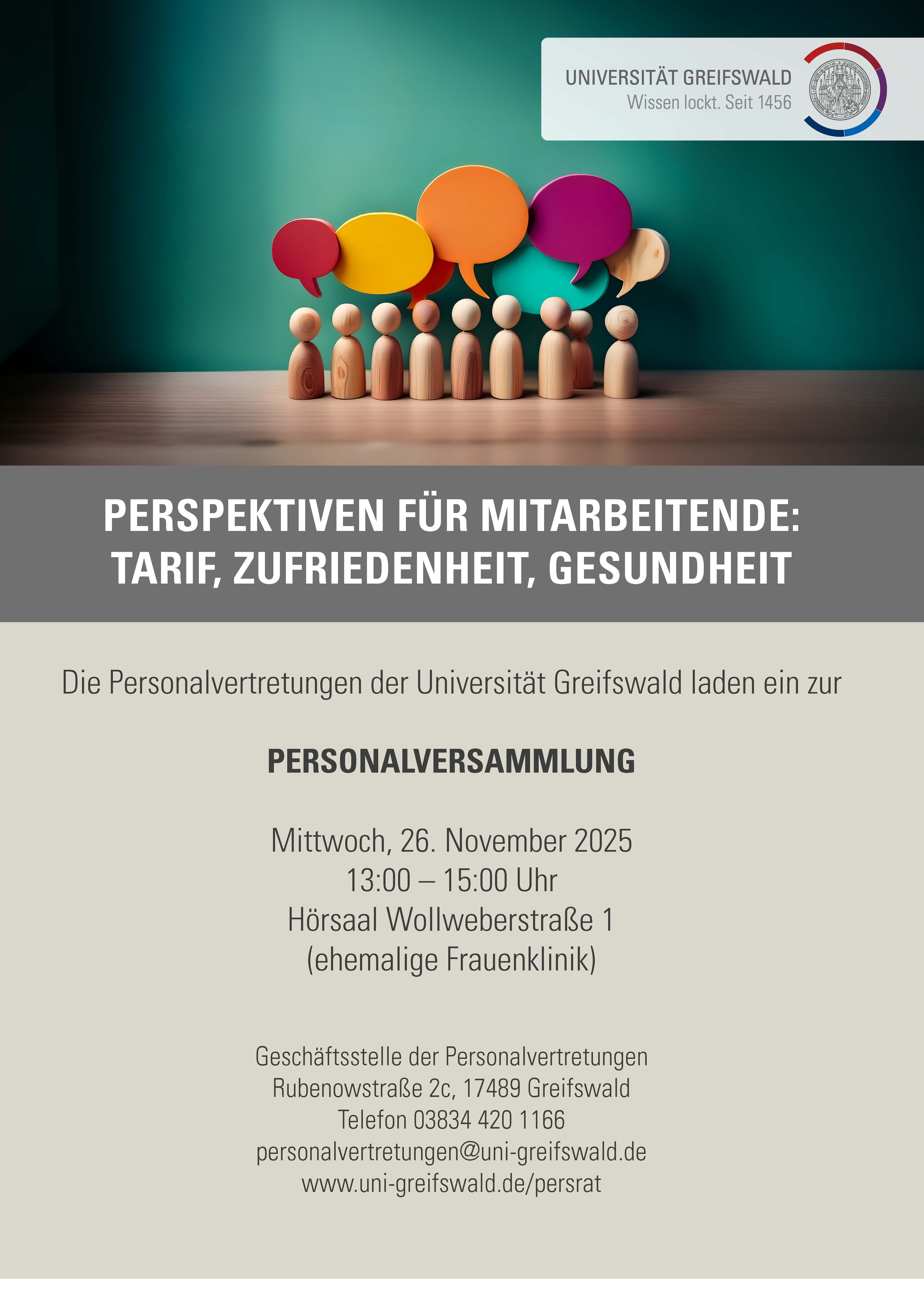 Wenn Sie vorab Fragen haben, senden Sie diese gern an die Geschäftsstelle der Personalvertretungen, Stefanie Lange (personalvertretungenuni-greifswaldde oder telefonisch unter +49 3834 420 1166). Ihre Anfragen werden selbstverständlich vertraulich von Frau Lange behandelt.